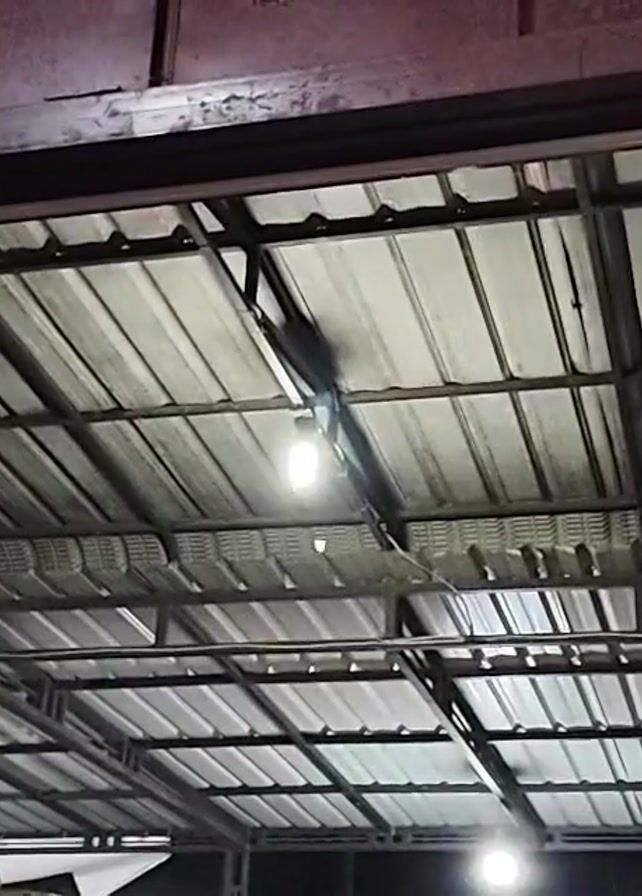 corrugated metal roof structure supported by a black metal frame, illuminated by two light bulbs