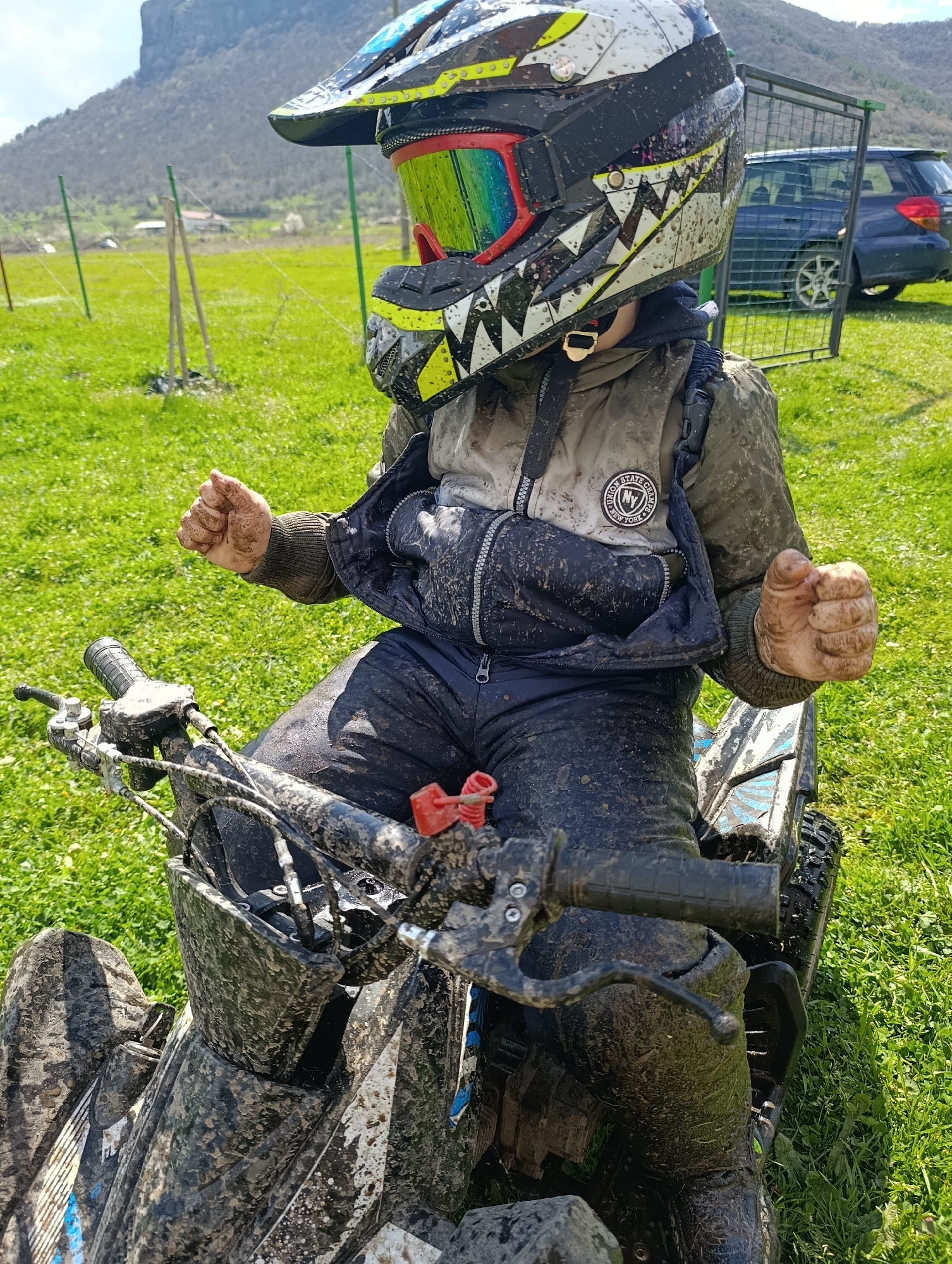 A child sits on a mud-covered ATV, wearing a helmet and goggles. The child is wearing a jacket and pants, both heavily soiled with mud. The surrounding environment consists of a grassy field. In the background, a mountain can be seen, and a fence with a dark blue car parked behind it is visible on the right. The photo was taken in Shiroko pole, Bulgaria.