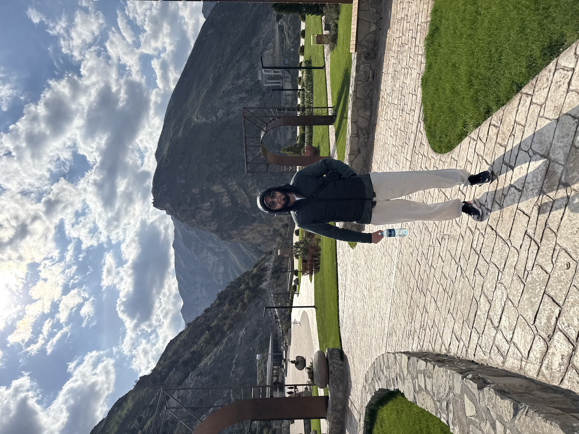 The photograph captures a scene in Novo-Zubutli, Russia, featuring a person standing on a paved pathway amidst a park-like setting with mountains in the background. The subject, dressed in casual attire including a dark jacket and light-colored pants, holds a water bottle in their right hand. The pathway is constructed of stone and is bordered by green grass. Metal archway structures are visible along the pathway. In the background, a prominent mountain rises against a sky with clouds. A building with a flag is situated in the middle ground.