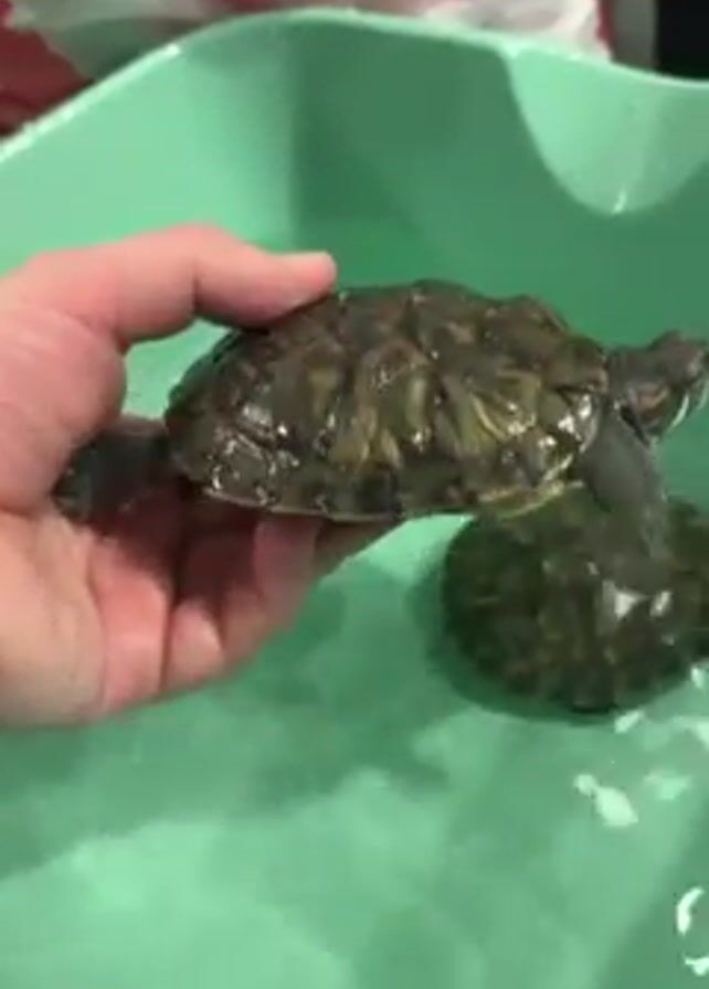 A hand holds a small turtle over a shallow tub of water. Another turtle sits in the water. The held turtle is turned over to show its shell, then righted again. The tub is a light green plastic. A white and red plastic bag sits in the background.