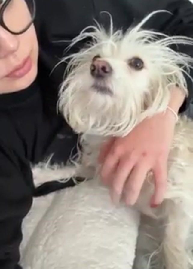 Here’s a description of the video. A woman with dark hair and glasses holds a small white dog. The dog has shaggy, unkempt fur. The woman is wearing a black sweatshirt and sitting on a white, plush cushion. She pets the dog, which looks directly at the camera. The dog appears to be whimpering quietly.