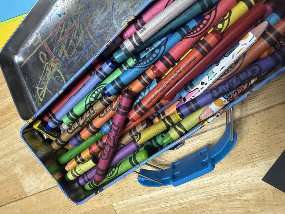 An open, light blue metal tin, consistent with a lunchbox or pencil case, rests on a light brown wooden surface with visible grain. The tin contains a dense, disorganized collection of approximately 50-70 assorted crayons and a few colored pencils, predominantly of the Cra-Z-Art brand, alongside Crayola and other brands. Visible details include one McDonald's branded crayon and one labeled "Strawberry Smoothie." The crayons display a wide spectrum of colors including red, orange, yellow, green, blue, purple, pink, brown, gray, and black, exhibiting signs of prior use with worn tips and some torn wrappers. The interior surface of the tin's lid is heavily marked with multi-colored crayon scribbles. A blue plastic handle is attached to the left side of the tin. In the upper right background, a corner of a bright yellow and a blue sheet of paper are partially visible. A small black object is present in the lower left corner. No individuals are present in the scene. The specific location within the city of Grayson, United States, is not discernible from the image, but the setting is indoors.