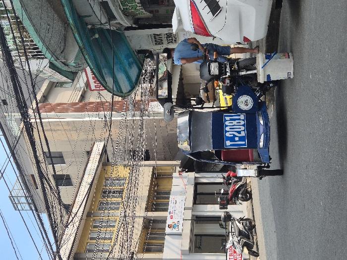 The image depicts a daytime street scene in Makati City, Philippines, characterized by urban infrastructure and commercial activity. In the immediate foreground, a blue and red tricycle, a common public utility vehicle, is parked facing the viewer. Its sidecar displays the license plate "T-2081" in white numerals on a blue background. A circular emblem, partially visible on the motorcycle portion, indicates "MAKATI CITY TRANSPORTATION OFFICE." A white plastic bucket with a blue handle rests on the sidewalk next to the tricycle's front wheel. To the right, the rear section of a white sedan or SUV is visible, parked curbside, featuring a red taillight and a black-and-white striped decal. In the midground, a male individual stands with his back to the viewer, positioned between the tricycle's motorcycle unit and the white car. He is dressed in a light blue t-shirt and dark blue shorts, wearing flip-flops, with his hands clasped behind his back. Behind him, the front wheel of the tricycle's motorcycle component is visible. The right side of the frame features a commercial building with a prominent turquoise awning. Signs on this building include "BOTIKA" (pharmacy) and "XERO" (likely a xerox service). Across the street, a multi-story yellow building is visible, with multiple windows and a sign reading "T. BLDG. THE AVE." and "FOR RENT." To the left, a white building displaying "DAIKIN" and "UNITS FOR RENT" signs is present, with two motorcycles parked on the sidewalk in front of it. The background and upper frame are dominated by a dense network of black overhead electrical and communication wires crisscrossing between poles and buildings, set against a clear, light blue sky. The architecture consists of multi-story urban buildings, some appearing aged, with one building featuring a vertical reddish-brown facade accent. The street surface is asphalt. The presence of the "MAKATI CITY TRANSPORTATION OFFICE" emblem on the tricycle definitively places the scene within Makati City.