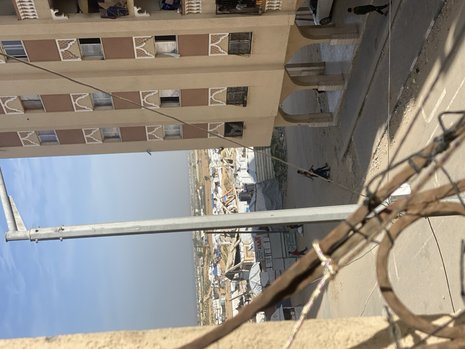 The scene unfolds from an elevated perspective, likely a rooftop, overlooking a densely populated area. A beige, multi-story building occupies the top portion of the view, its architectural details visible along its facade and archways. Below, a large, camp-like setting spreads out, filled with numerous structures and activity. People walk along the edges of the camp. In the foreground, a metal post and barbed wire obscure some details. A thick wire runs diagonally across the scene.