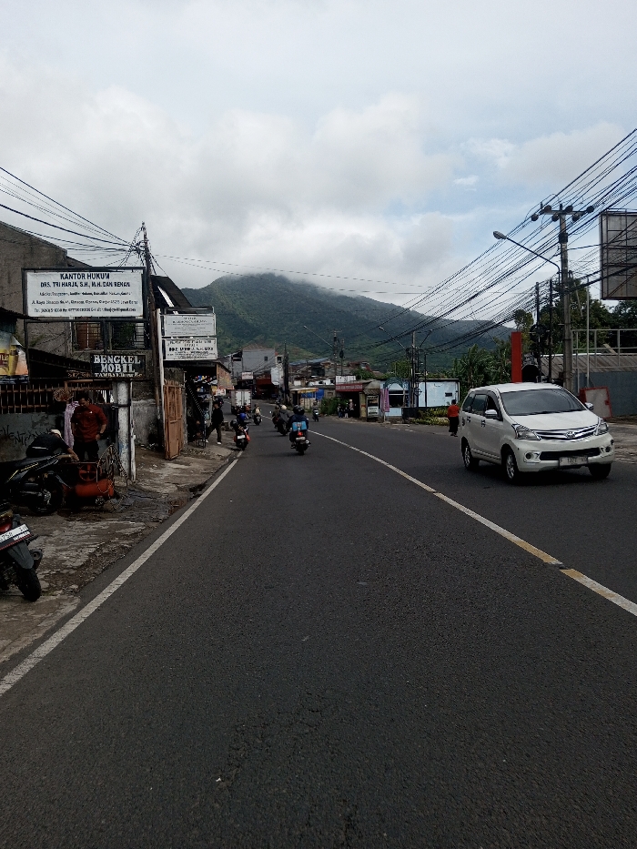 The image depicts a street scene in Saing Ta Mawt Lay, Myanmar, under an overcast sky with a large, green mountain partially obscured by clouds in the background. A dark asphalt road with white solid and dashed lane markings occupies the center and right side of the frame. On the left, a sidewalk features parked vehicles, including a black motorcycle in the foreground and another black motorcycle next to a red air compressor. A man in a red shirt stands near the air compressor. Buildings line the left side of the street, displaying signs in Indonesian: one prominent sign reads "KANTOR HUKUM DRS. TRI HARJA, S.H., M.H. DAN REKAN" (Law Office) and another below it states "BENGKEL MOBIL TAMBAL BAN" (Car Repair / Tire Patching). Numerous utility poles and a dense network of overhead wires are visible along the left. Traffic on the road includes several motorcycles, some with riders, moving away from the viewer. A white Toyota Avanza-type car, bearing the Indonesian license plate "F 1827 PP", travels on the right side of the road, also moving away from the viewer. A person in an orange shirt is visible on the far right, near the roadside.