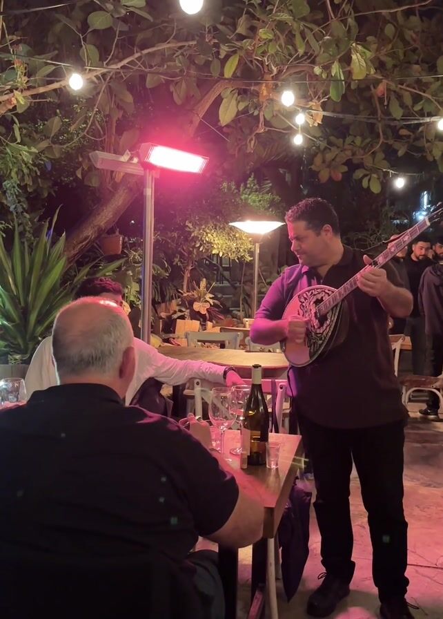 three men at a table outside a restaurant. One man is seated with his back to the camera, another is sitting opposite him, and the third is standing playing a bouzouki. The restaurant has outdoor seating, string lights overhead, and a patio heater. There are people visible in the background. A bottle of wine is on the table.