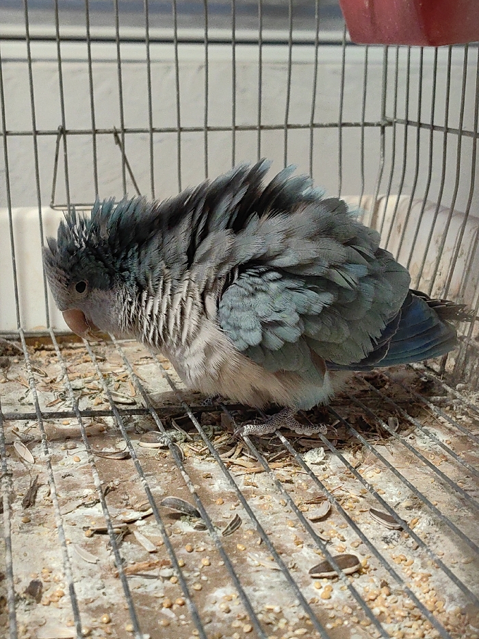 - "An isolated Quaker parrot, exhibiting predominantly blue-grey and pale grey plumage, stands within a metal wire cage" by FM-tqeth1, licensed under CC BY 4.0