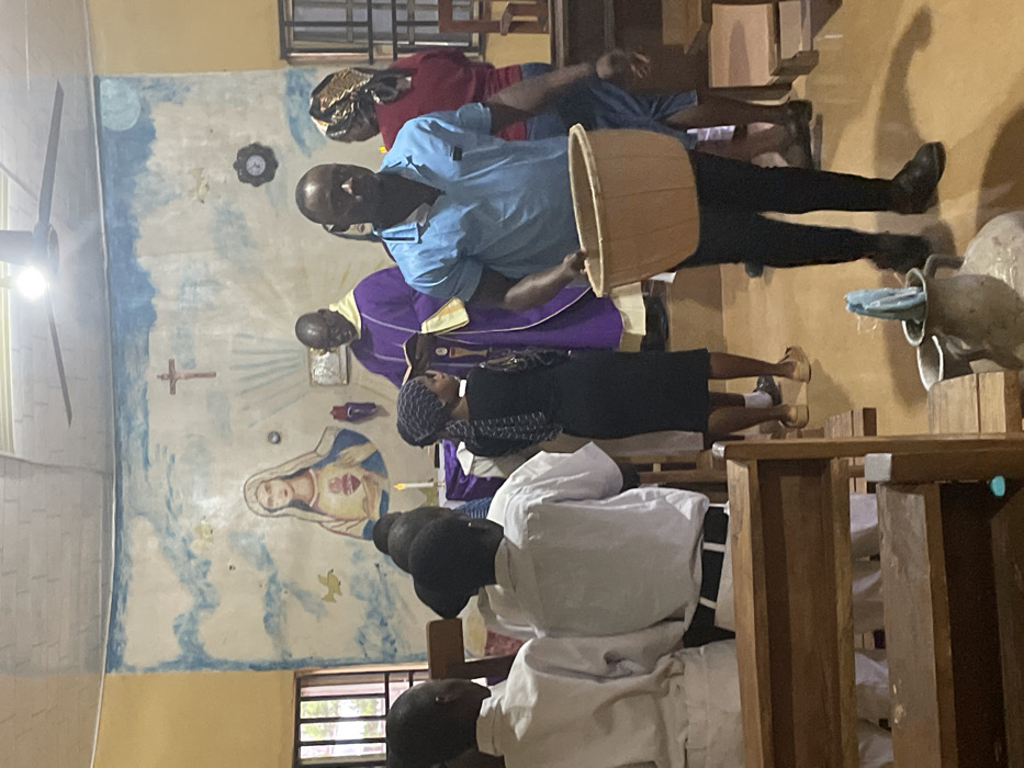 Inside a church, a priest in purple robes stands beside a mural of Mary, a cross, and sunbeams. A man in a blue shirt holds a collection basket, walking along a pew of kneeling congregants. One woman wears a black dress and head covering. Some churchgoers face forward, heads bowed in prayer. Another man in red stands behind the collector. The ceiling has a fan and the walls are painted yellow.