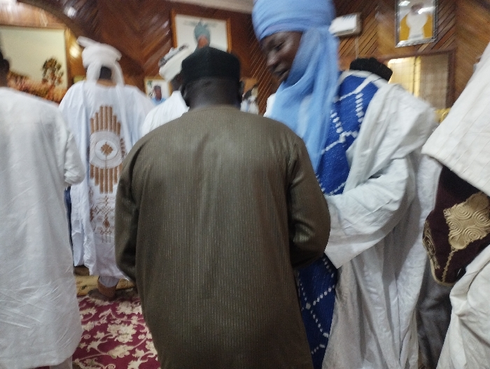 The image depicts a gathering of men in a room in Kaltungo, Nigeria (latitude: 9