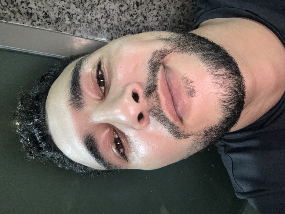 This image presents a close-up, low-angle portrait of an adult male in Casablanca, Morocco. The subject features dark, curly hair, dark eyebrows, and a neatly trimmed dark beard and mustache. His skin is of medium tone, displaying erythema (redness) on the forehead and around the orbital areas, with a visible sheen suggesting moisture or oiliness. His dark eyes are open and directed towards the camera, while his lips maintain a neutral, slightly upturned resting position. He is clad in a dark-colored, short-sleeved garment. The background to the subject's left is a dark, uniform surface, possibly greenish-black, exhibiting minimal, diffuse light specks. To the subject's right, a vertical section of a light grey, speckled material, consistent with polished granite or marble, is visible, separated from the dark surface by a thin, reflective vertical strip.