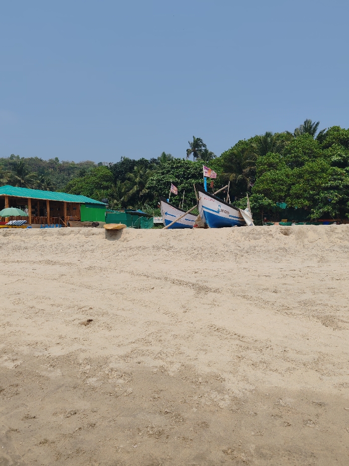This image depicts a sunlit beach scene in Arambol, India