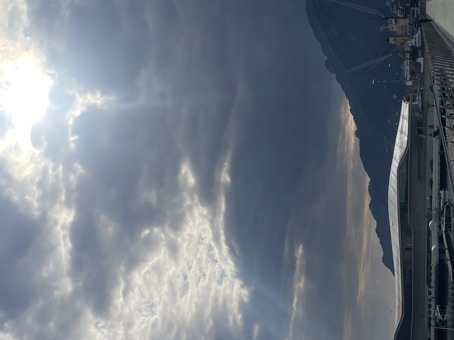 The image depicts the port area of Salerno, Italy. A paved promenade with a metal railing extends from the lower right foreground. The prominent structure in the mid-ground is the Salerno Maritime Terminal, characterized by its modern, fluid, wave-like white or silver architectural design, situated adjacent to a marina containing several small vessels. To the right of the terminal, the industrial section of the port is visible, featuring multiple tall cranes and large cargo ships. A single, dark human figure is discernible walking on the promenade in the mid-right. The background consists of a range of dark, steep mountains. The sky is heavily overcast with dark grey clouds, but bright sunlight penetrates through an opening in the upper right, casting visible rays downwards.
