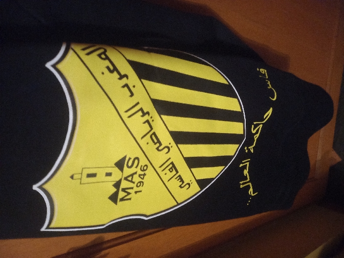 A black garment features a yellow shield emblem outlined in white. The shield displays black horizontal stripes, a lighthouse symbol with "MAS 1946" beneath it, and Arabic text encircling its top half. Additional Arabic text curves alongside the shield on the garment itself. The design's color scheme is yellow and black.
