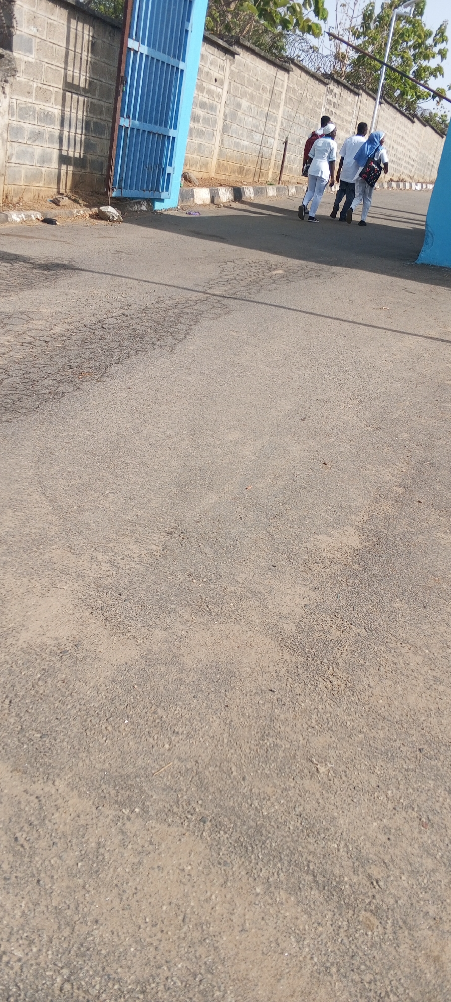 The scene is an outdoor daytime shot taken in Keffi, Nigeria. In the background, three individuals walk along a road behind a grey block wall topped with razor wire, with a blue gate partially visible on the left. The figures appear to be two adults wearing white tops and one individual with a red top. The foreground is dominated by the asphalt road, which shows signs of wear and discoloration. The light suggests a sunny day.