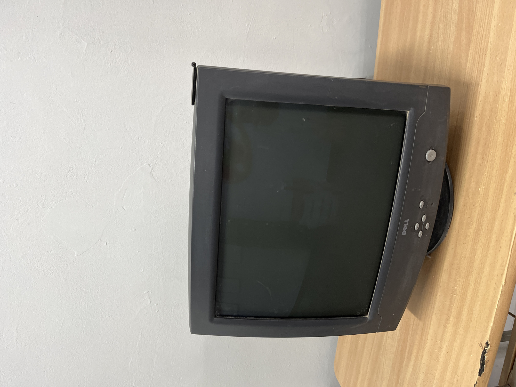 Dell CRT monitor sitting on a light-colored wooden surface, likely a table