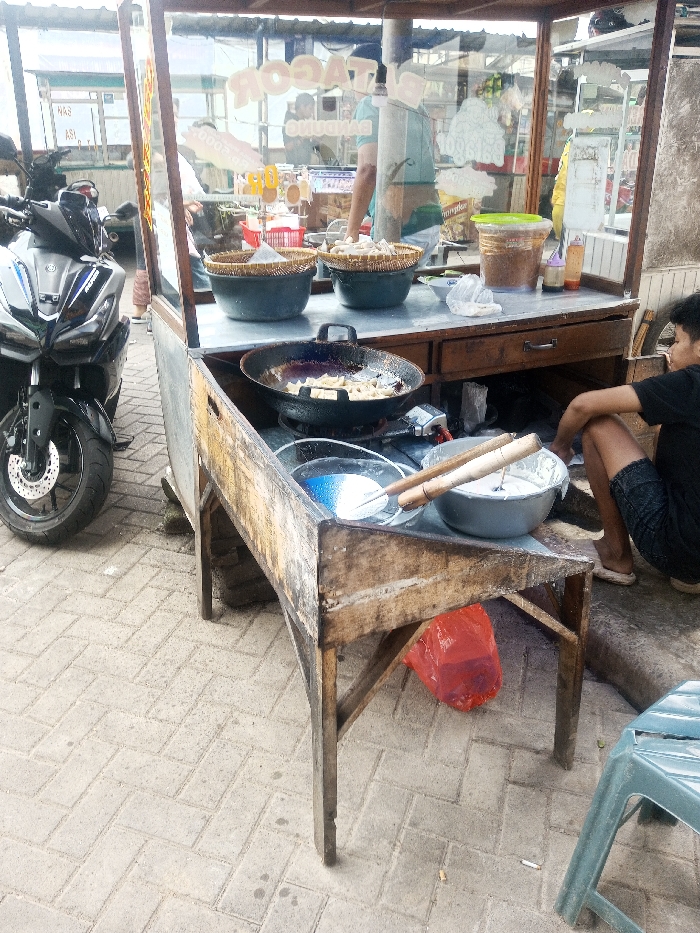 A street food vendor's cart features a fryer with cooking items, baskets of fried goods, and condiments