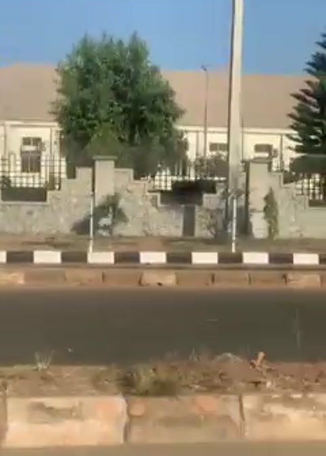 The video depicts a street scene with a building on the opposite side of the road. The building is beige with a light-colored roof and features a stone fence with black iron bars. The road is paved and has a black and white curb. An auto rickshaw passes by on the road. The sky is clear and blue. The ground along the roadside is dirt-colored and appears somewhat eroded. The perspective is that of someone filming from a moving vehicle.