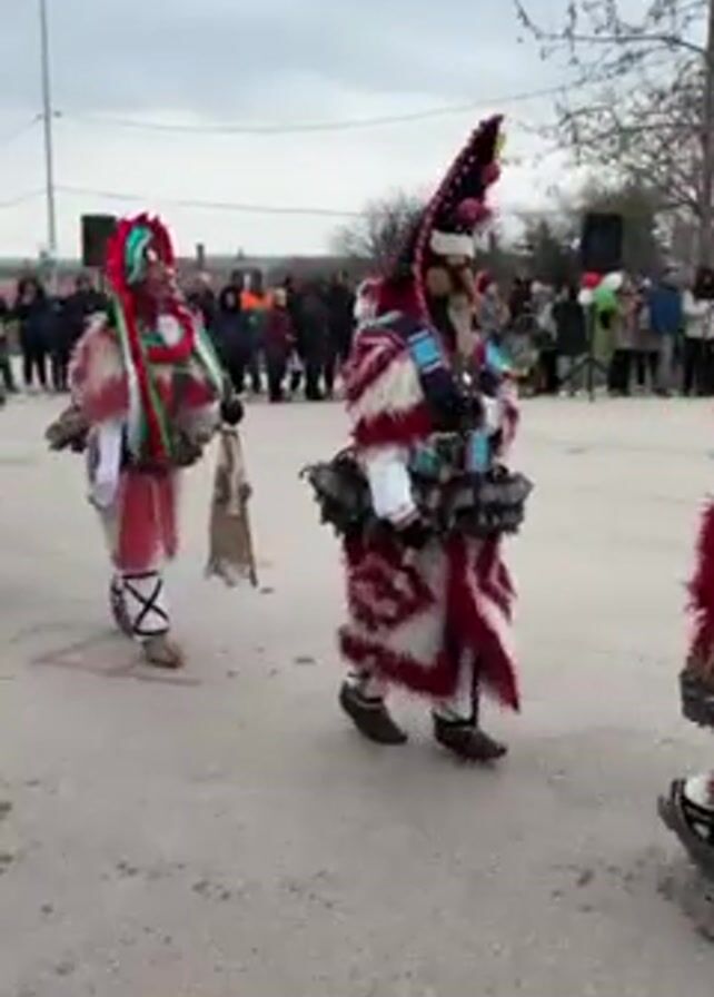 four people performing a traditional dance outdoors in front of a small crowd. Each dancer is wearing an elaborate, colorful, traditional costume that consists of a fur-trimmed red-and-white robe, patterned leggings and shoes, and a tall, pointed headdress adorned with feathers and other decorations. The costumes also include a series of large bells around the waist, which ring as the dancers move. One of the dancers carries a stuffed animal, another a decorated staff, and a third carries what appears to be a small shovel. The dance seems to involve rhythmic steps and turns, with the bells creating a loud, percussive sound. The crowd in the background includes people of all ages and genders, who are watching the performance with interest. The setting appears to be a village square or a similar public space, with simple buildings and bare trees visible in the background under an overcast sky.