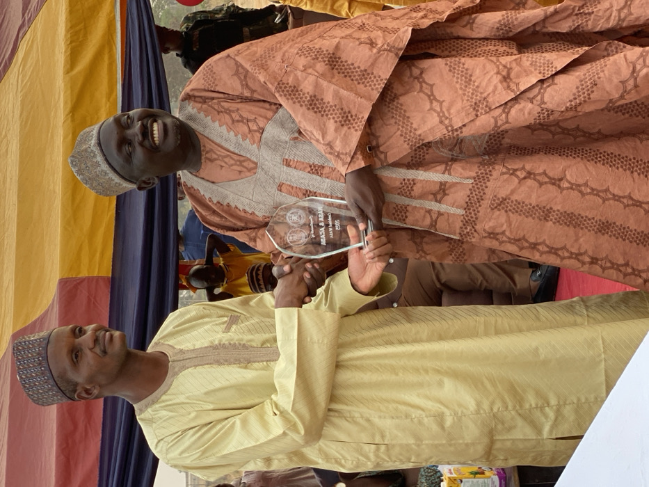 Two men in traditional clothing shake hands while holding an award. The man on the left wears a light yellow robe and a patterned cap. The man on the right wears a patterned brown robe and a similar cap. They both smile. In the background are colorful drapes and several other people. The award appears to be a clear acrylic plaque with text and logos on it.