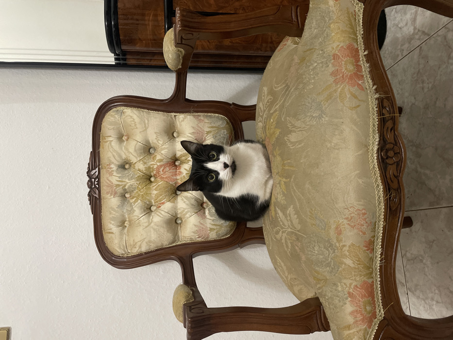 - "A black and white tuxedo cat sits in an antique chair with tan, floral patterned upholstery" by FM-uxU7C3, licensed under CC BY 4.0