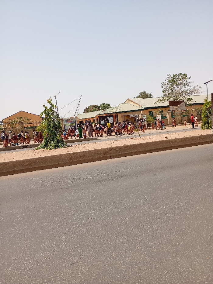 The image depicts a daytime scene outside the Nursery & Primary Demonstration School of the Federal College of Education (Technical) in Jos, Nigeria