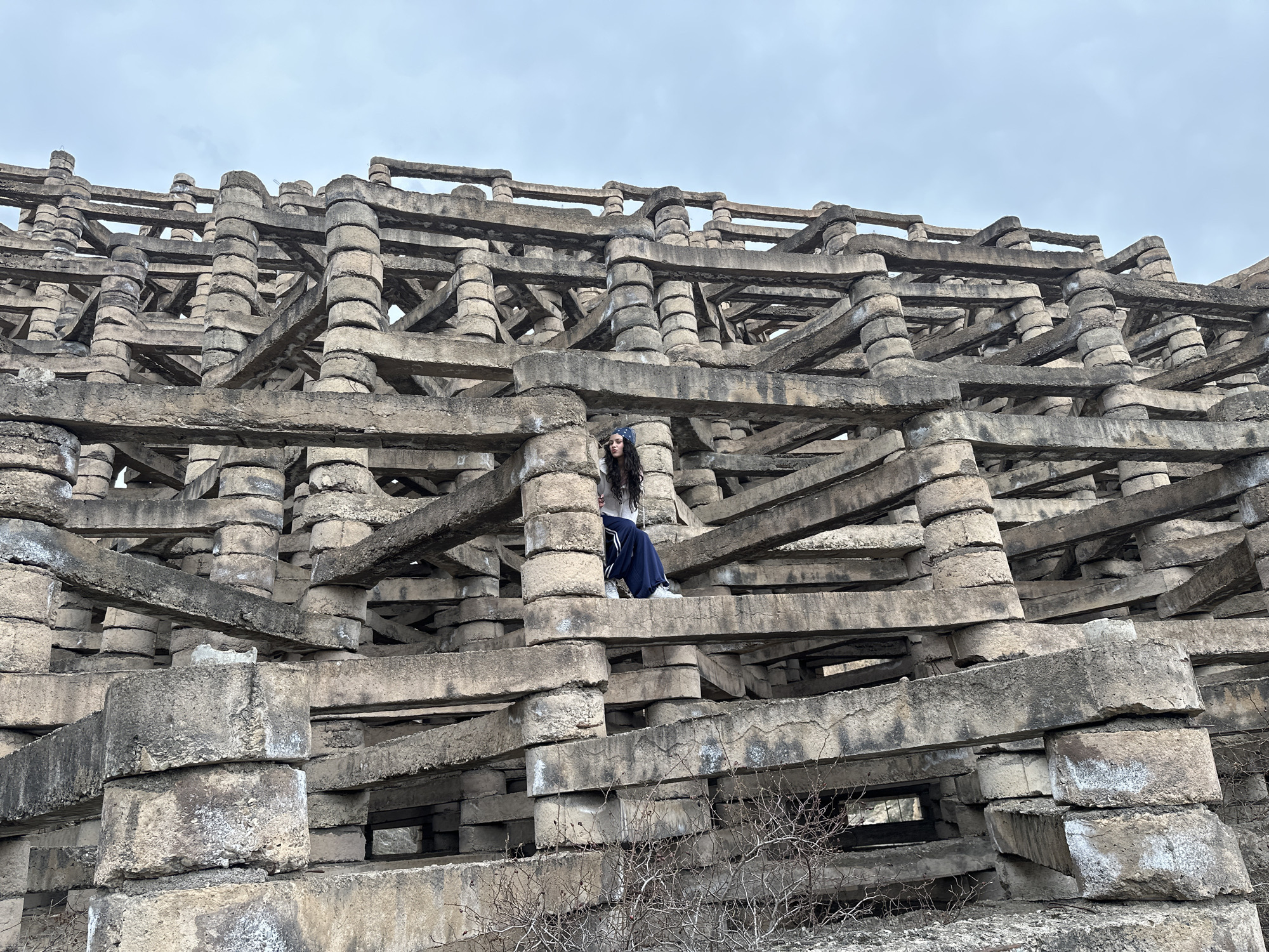 The image displays a vast, multi-layered concrete structure in Areni, Armenia, under an overcast grey sky. The structure is composed of numerous interlocking horizontal beams and stacked cylindrical blocks, forming a dense, weathered grid-like framework exhibiting various shades of grey and brown, with some white residue. A lone female is seated on a horizontal concrete beam within the upper-middle section of the structure. She has long, dark, wavy hair and is wearing a blue patterned bandana, a light-colored long-sleeved top, dark blue track pants with white stripes down the sides, and light-colored sneakers. Her posture is relaxed, and she faces slightly left within the frame. Sparse, dry, thorny bushes are visible in the immediate foreground, at the base of the concrete edifice.