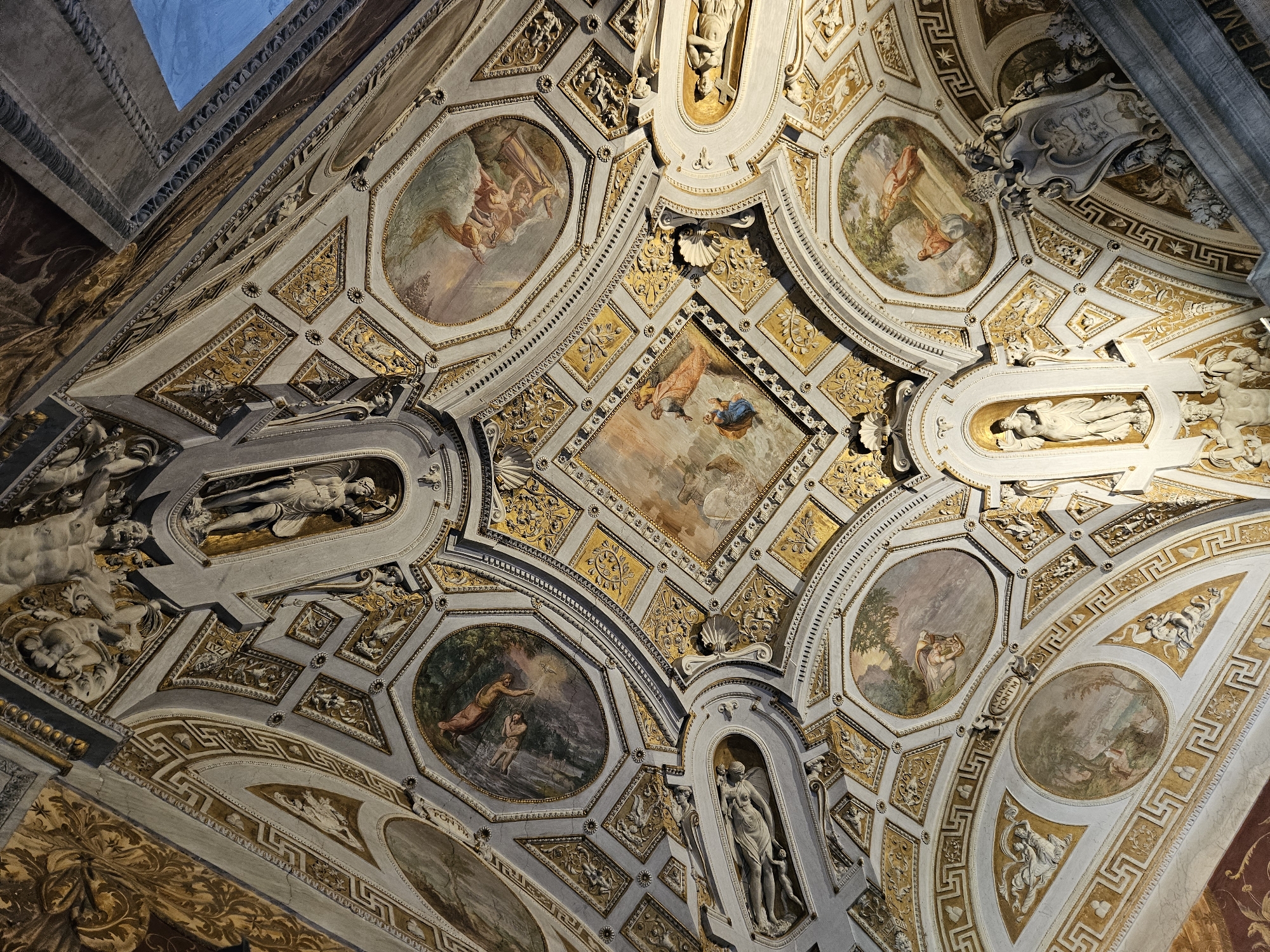 The image depicts an ornately decorated ceiling in what appears to be a historic building in Rome, Italy