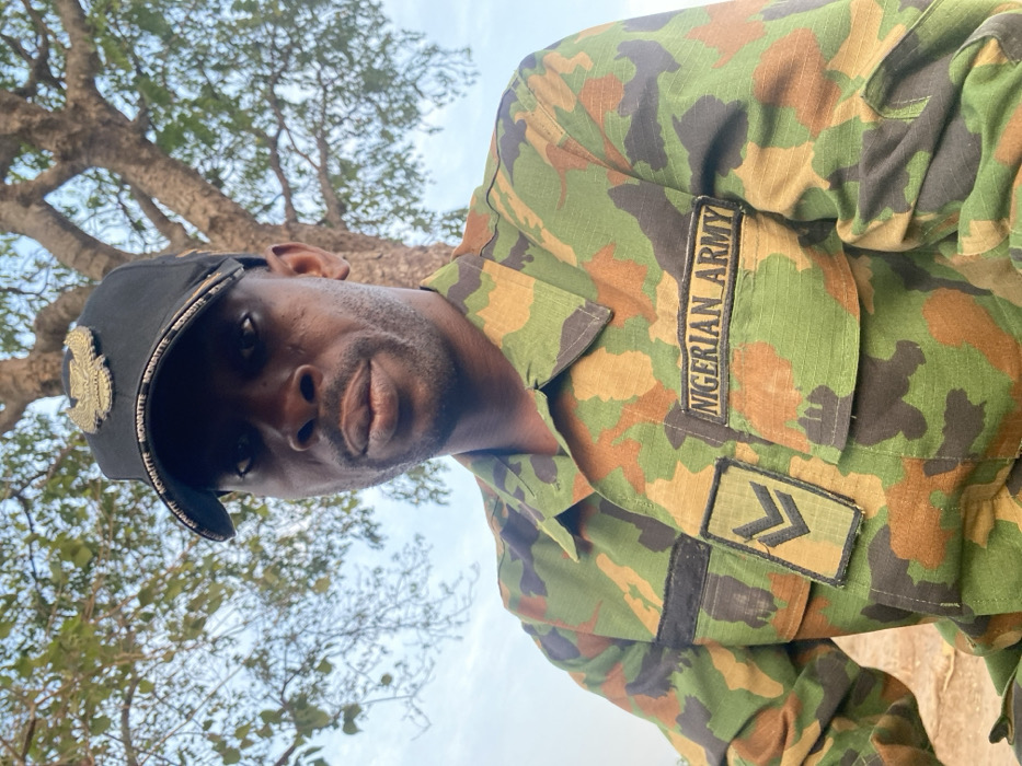 A man wearing a Nigerian Army camouflage uniform and black cap stands under a tree