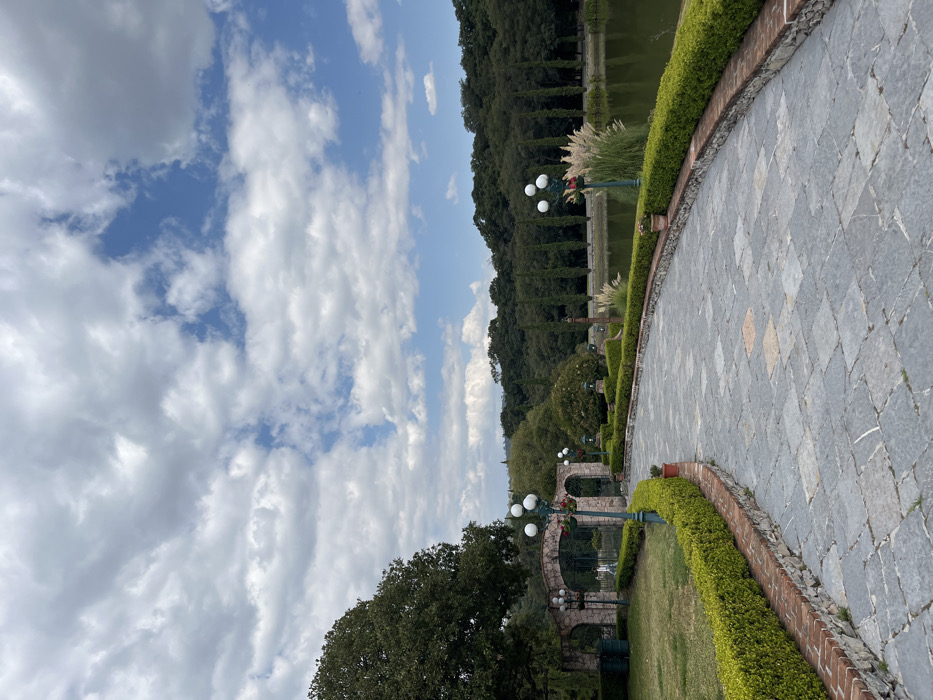 This image depicts a landscaped outdoor environment within Haras Ciudad Ecológica, Mexico, under a partially overcast sky featuring scattered white clouds and visible patches of blue