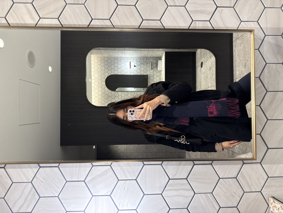 A person is taking a mirror selfie in a public restroom. The person is wearing a dark coat and a patterned scarf. The restroom has hexagonal tile walls and a large rectangular mirror. The mirror reflects a view into another part of the restroom with white tiled walls and a smaller rounded mirror above a dark surface. The person's face is partially obscured by their phone.