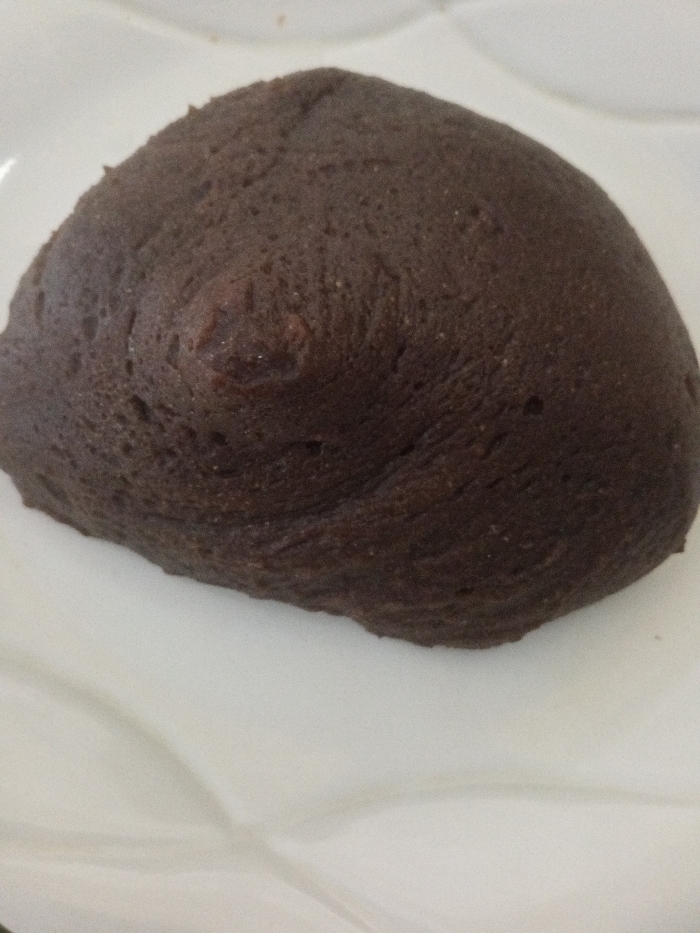 A single, dark brown, dome-shaped food item rests centrally on a white, textured plate