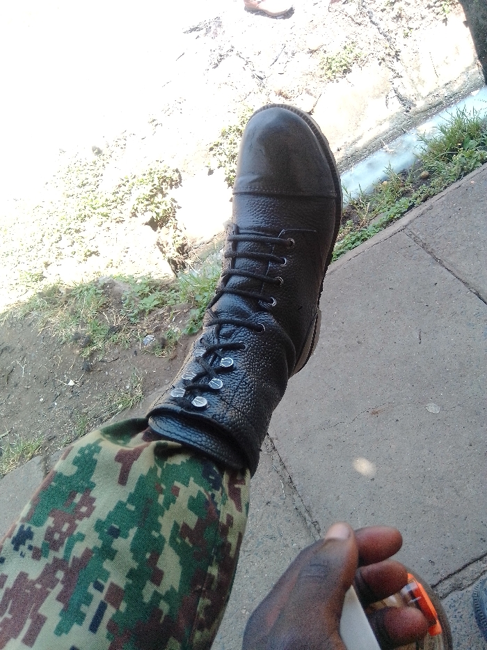 The image presents a close-up, downward-angled view of a person's lower right leg and right hand. The leg is clad in digital camouflage trousers, exhibiting a pattern of green, brown, and tan pixelated shapes. A black, high-laced combat boot with a textured, pebbled leather finish and silver metallic eyelets covers the foot. The boot laces are black. The person's dark-skinned right hand is visible in the lower right foreground, holding a small, reflective, transparent object with an internal orange and brown pattern. The skin on the hand appears darkened or soiled. The immediate ground surface is light grey concrete. To the left of the boot, the ground transitions to an unpaved, uneven dirt area with sparse green and dry vegetation. To the right of the boot, a narrow, shallow channel or ditch contains light-colored liquid and green vegetative growth. The scene is brightly lit, indicative of daylight conditions. No other individuals are visible. While specific landmarks are absent, the general environmental characteristics—a mix of concrete and unpaved ground with a drainage channel—are consistent with urban or peri-urban settings within Nairobi, Kenya.