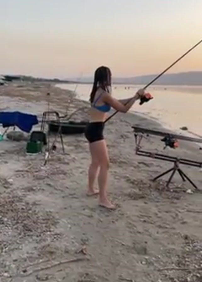 A woman in a blue top and black shorts is standing on a sandy beach, holding a fishing rod and reel. The beach slopes down to a calm lake that reflects the warm light of the setting sun. In the background, there are rolling hills and the sky is a gradient of colors, from orange to pink. Beside the woman, there are multiple fishing rods set up on tripods. There are also other items on the beach, including a tire, some camping gear, and other people in the distance. She is focused on the line in the water, and someone is saying words in a language other than English.