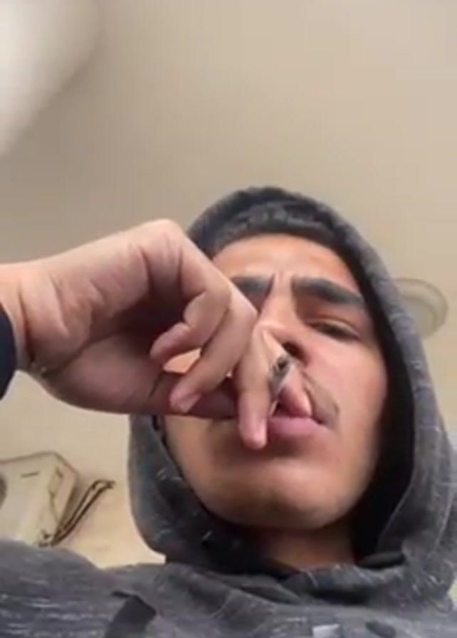 A young man is seen from a low angle, wearing a gray hooded sweatshirt. He is holding a lit cigarette between his fingers and smokes it, exhaling a large cloud of smoke towards the camera. The background shows a light-colored ceiling and a portion of an air conditioning unit on the wall.