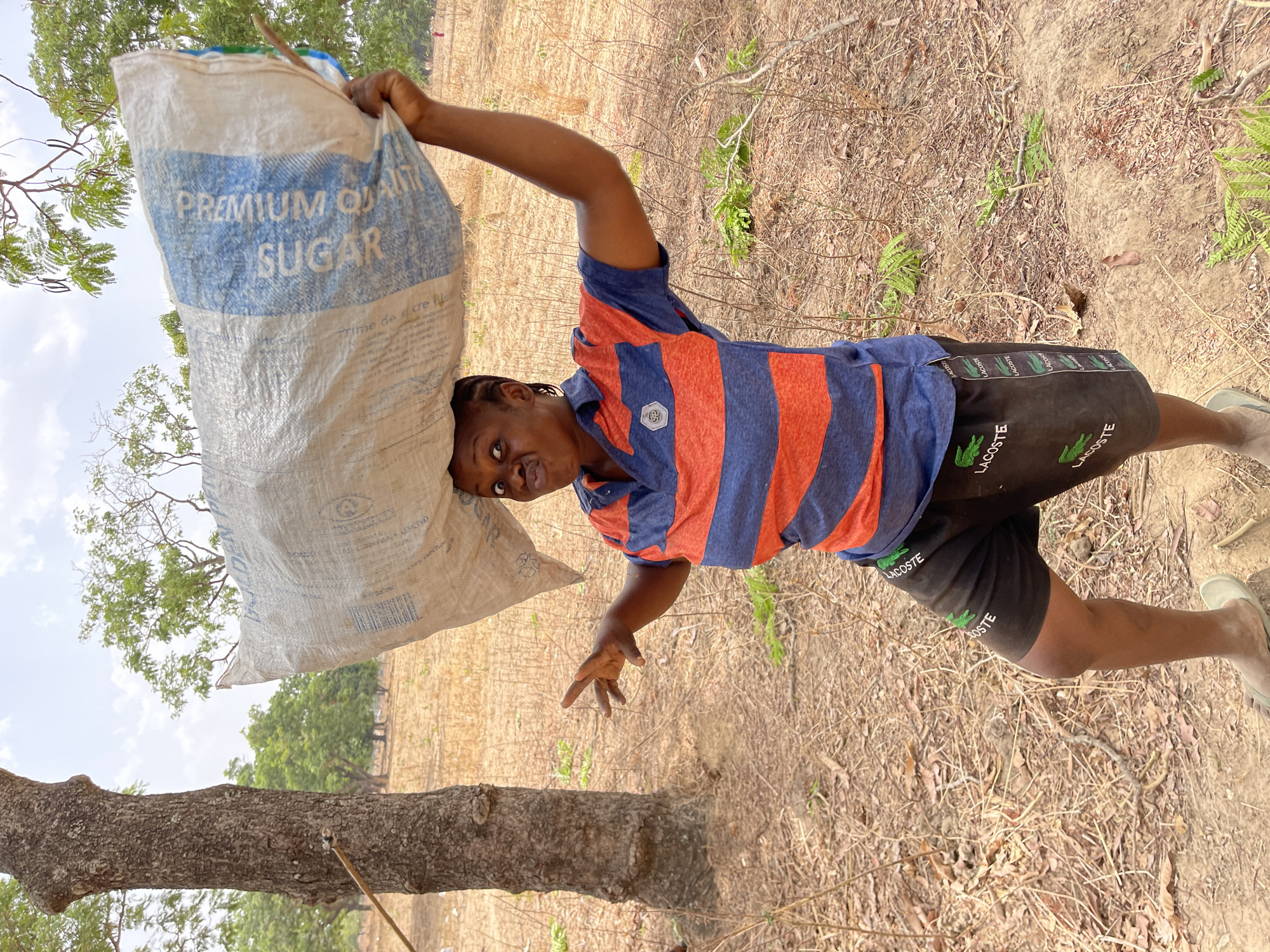 An adult individual stands outdoors in Akwanga, Nigeria. The subject, with dark skin and braided hair, wears a blue and orange striped short-sleeved polo shirt, black shorts adorned with "LACOSTE" logos, and light-colored flip-flops. A large, white woven plastic sack, visibly labeled "PREMIUM QUALITY SUGAR" in blue text, is balanced on their head, supported by their raised left arm. Their right hand is open with splayed fingers, and their face displays a humorous expression with wide eyes and pursed lips. The ground is dry, light-brown earth, covered with scattered dead leaves, twigs, and sparse green undergrowth. A large tree trunk is positioned to the left, with other deciduous trees in the midground and background beneath a partly cloudy sky.