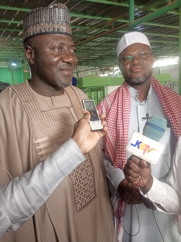 two men standing and being interviewed. The man on the left is wearing a brown robe with gold embroidery and a black and gold cap. He is holding a small recorder in his right hand. The man on the right is wearing a white shirt, a red and white patterned shawl, and a white cap. He is holding a microphone in his right hand. The microphone has a black cable and a black and blue body with the letters "KBTV" printed on it in yellow, blue, and red. The background of the image is a green and white lattice structure. The location of the image is Birnin Kebbi, Nigeria, based on the provided coordinates.