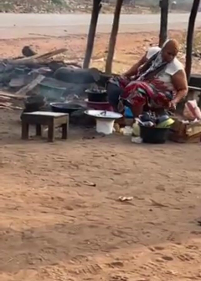 woman sitting under a small, open-sided shelter, presumably cooking food. She is wearing a light-colored shirt with a floral pattern, a colorful wrap skirt, and a headscarf. In front of her is an assortment of containers and cookware, including pots, pans, and bowls. A fire pit with burning wood is situated to her left, with smoke rising. There's a small wooden stool nearby. The ground is dusty, and a road is visible in the background. The environment appears to be a rural or semi-rural setting, with simple buildings and vegetation in the distance.
