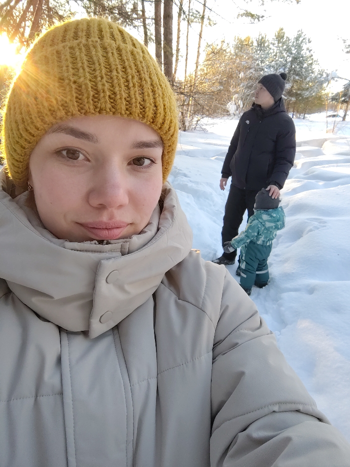 An outdoor winter selfie taken in Марковский, Russia, features three individuals. In the foreground, an adult female with light skin and brown hair wears a yellow knitted beanie and a light beige puffer jacket, looking directly at the camera with a neutral expression. A bright sun flare is visible on the upper left. Behind her, to the right, an adult male stands, wearing a dark grey beanie and a black puffer jacket, looking upwards and to the right. His left hand rests on the head of a young child, who is dressed in a teal and white patterned snowsuit and a dark beanie. The child faces slightly right and away from the camera. The ground is covered in deep, white snow with visible foot tracks. The background consists of bare deciduous trees and evergreen conifers, suggesting a wooded environment under a clear, sunny sky.