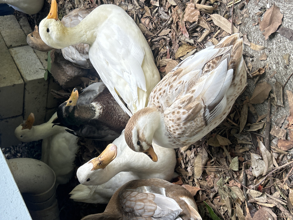 - "The scene depicts multiple domestic ducks resting on a ground covered with dry, brown leaves in Russell Vale, Australia" by FM-A0fME3, licensed under CC BY 4.0