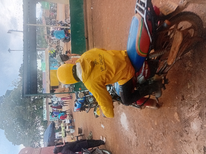 The image displays an outdoor scene in Chevaywa ward, Kenya, on an overcast day, centered on a dirt road or open area with commercial activity. In the immediate foreground, a person is seated on a red and blue motorcycle, viewed from behind. The individual wears a bright yellow full-face helmet and a matching yellow hooded jacket with "VP GROUP" and "Growing for a better future" printed on the back. Dark pants and dark footwear are visible. The motorcycle has a distinctive blue, red, green, and yellow striped seat. The ground is reddish-brown dirt, marked by tire tracks and small puddles. In the midground, to the left, a person in dark clothing stands near a market stall under a dark blue umbrella, where green produce (possibly watermelons or gourds) is displayed. Directly behind the motorcycle operator, a person in a light brown shirt and grey hat looks towards the right. A prominent green metal-framed shelter with a roof extends horizontally across the midground. Multiple other individuals are visible throughout the midground, dressed in casual attire, standing, walking, or operating other motorcycles. The background consists of a row of single-story buildings, presumably shops or businesses, with varied paint colors including light blue, green, and yellow. A large, mature tree with dense foliage occupies the upper left background. Overhead utility wires and poles are present. Signs on the buildings are mostly unreadable, though "M-PESA" is partially discernible on one. More motorcycles and people are visible further down the street, and distant hills or structures are faintly outlined on the right horizon.