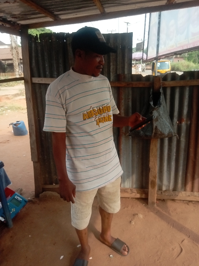 A man wearing a striped shirt, shorts, and a baseball cap is standing in front of a corrugated metal wall. He holds a phone in his right hand and is looking at it. He is standing on a dirt surface and wearing flip-flops. A black plastic bag hangs from the metal wall. A building and a yellow vehicle can be seen in the background. The man is standing under a corrugated metal roof.