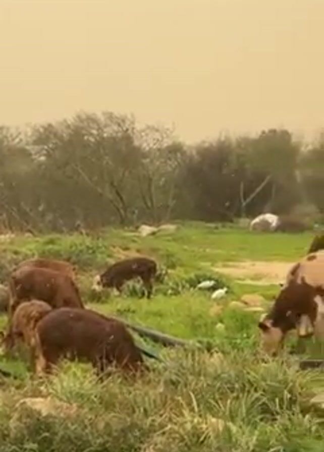small herd of brown cows grazing on a grassy field under an orange sky. There are trees and some other vegetation in the background. Further in the background, a vehicle and buildings are visible through the haze. The cows are spread out across the field, some clustered together as they eat. There appears to be some light precipitation falling.