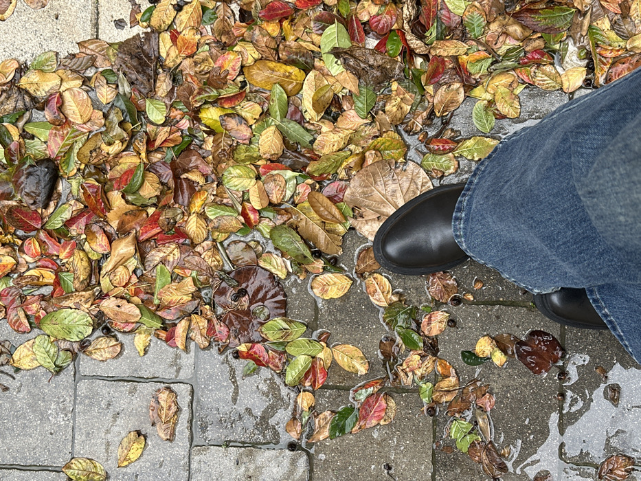 The image displays an overhead view of a wet paved sidewalk in Petah Tikva, Israel. The grey, rectangular pavers are largely obscured by a dense layer of fallen leaves in various stages of decomposition and color, including green, yellow, orange, red, and brown hues. Numerous leaves are visibly wet, and small puddles of water are present on the pavement surface, some containing submerged leaves. Dark, spherical seed-like objects are scattered among the foliage. The lower legs and feet of an individual are positioned in the bottom half of the frame. The individual is wearing blue denim jeans and sturdy black boots with thick soles; the left boot is fully visible, while the toe of the right boot is partially seen. The subject appears to be standing or walking on the leaf-covered, wet ground.