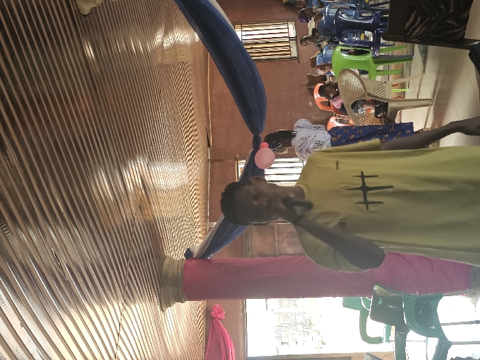 A person stands in front of a gathering of people sitting on chairs. The room has striped walls and is decorated with blue and pink fabric. A pink balloon is tied to the blue fabric. The person is wearing a yellow shirt with a black design. The chairs are various colors including blue, green, and orange. Windows are visible in the background.
