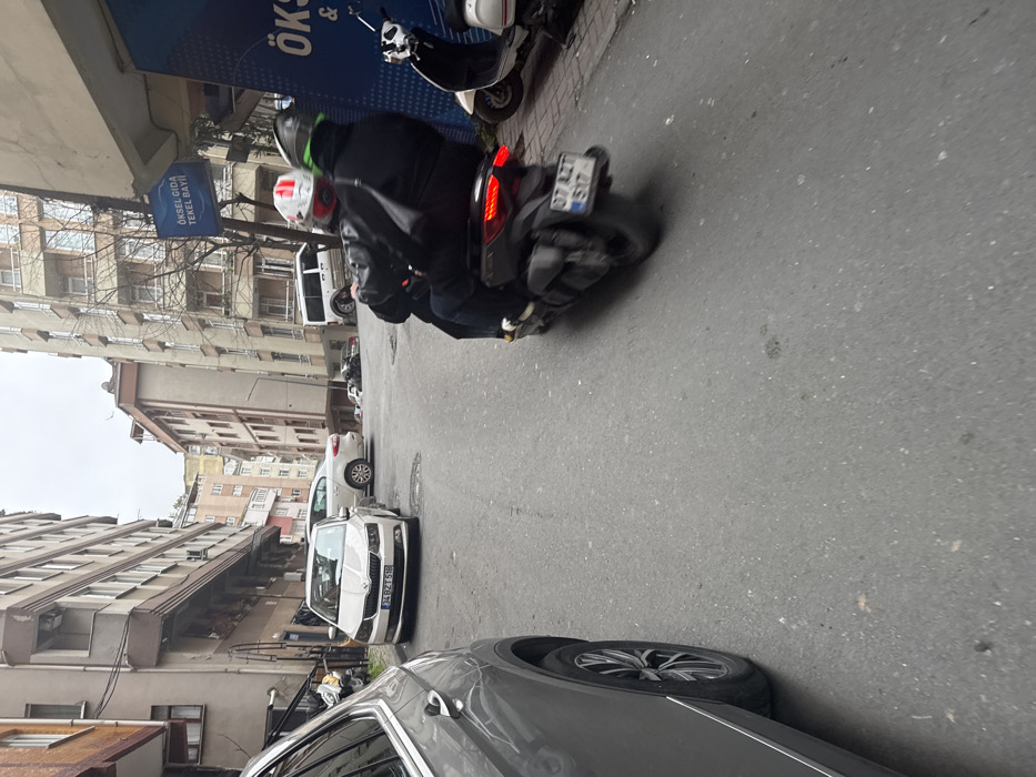 A street scene depicts parked cars and a scooter with two riders. Buildings line the street, and a sign is visible on one of them. The scooter has a license plate that reads "07 AZT 517." The riders are wearing helmets. A white car is parked next to a grey car. The street is narrow, with cars parked along both sides.