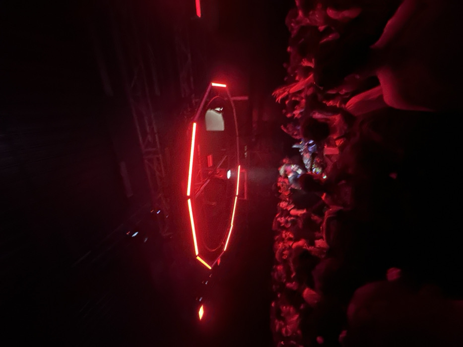 A dark amusement park ride features a river with boats outlined in red lights