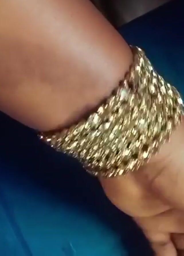 person's arm wearing a wide, gold-colored beaded bracelet. The arm and hand are resting on a blue surface. The person wiggles their fingers slightly.