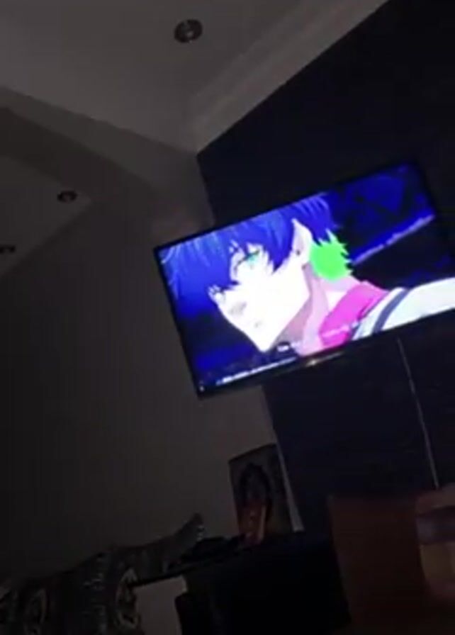 A person is watching anime on a TV in a darkened room. The anime features a male character with blue hair, then another with pink hair. The person holds up their hand in a peace sign towards the screen.
