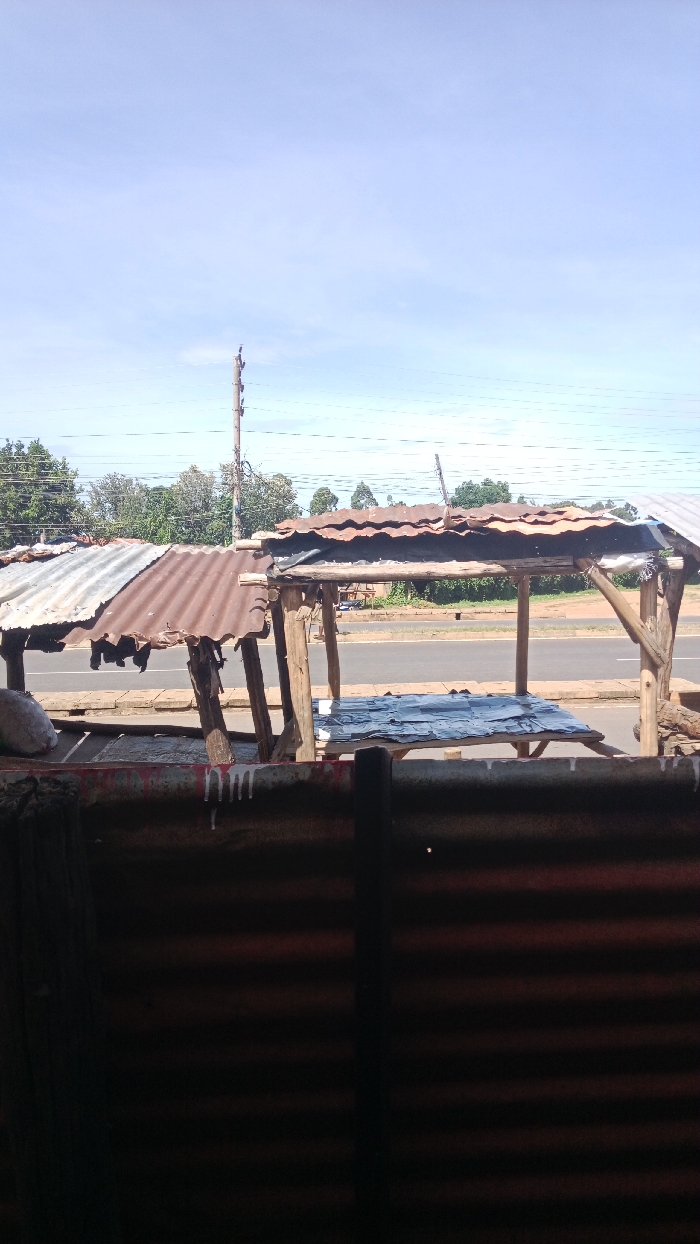 The image depicts a view from within a corrugated metal structure, looking out at roadside stalls. These stalls are constructed of wood and topped with rusty corrugated metal roofs. A paved road is visible beyond the stalls. Trees line the road further in the distance under a clear blue sky. An electricity pole stands near the stalls, adding to the rustic, rural scene.