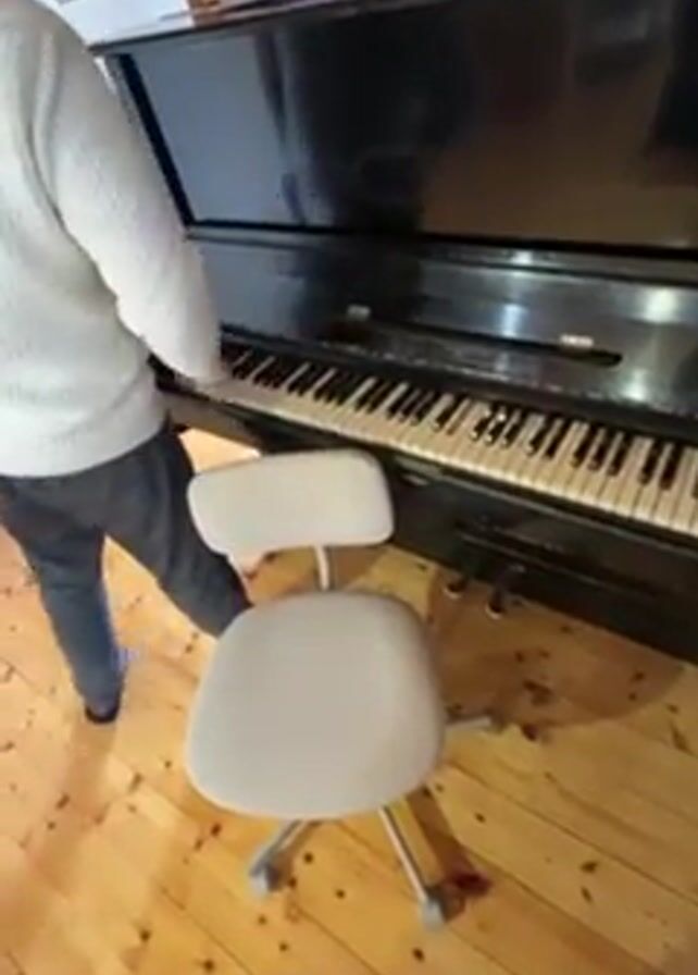 A man in a white sweater and dark pants stands and plays an upright piano. The piano is black. He then walks away from the piano, leaving a gray rolling chair in front of it. The floor is made of planks of light-colored wood. A pair of gray shoes can be seen on the floor to the left of the chair. There is a piece of art atop the piano. A wooden beam is visible behind the piano.